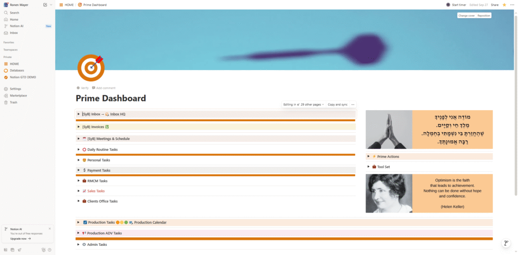 This means that every morning I start my day with Notion, and every evening I close my day with Notion, while spending considerable hours in between across various Notion screens, mainly the Prime Dashboard.
